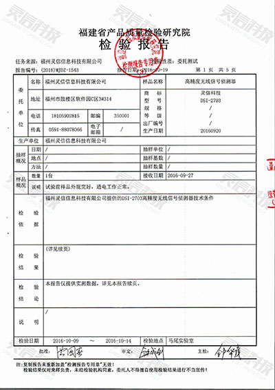 福建靈信信息科技有限公司自主研發(fā)、生產(chǎn)的DSI2703高速無線信號偵測器,通過福建省產(chǎn)品質(zhì)量檢驗研究院的嚴(yán)苛考驗,各項指標(biāo)合格,取得了檢驗報告。